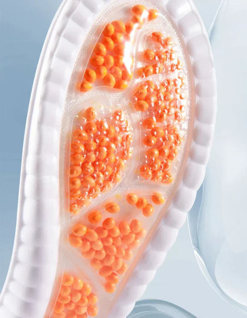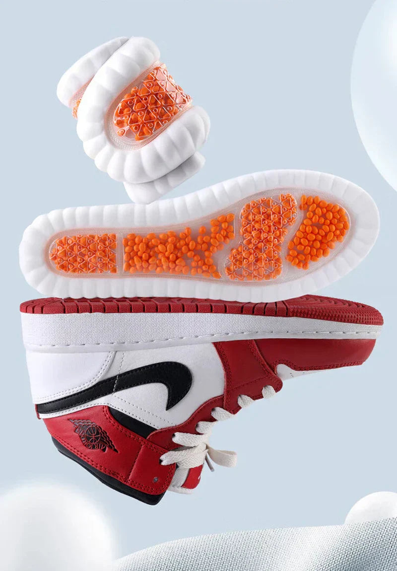 Les petites billes orange et bleu, sont en réalité des petits coussinets d'air stratégiquement placé sur les semelles afin d'offrir un amorti supplémentaire là où vous en avez le plus besoin. Ces coussins d'air absorbent les chocs à chaque impact, réduisant ainsi la pression exercée sur vos pieds, vos genoux et vos articulations. Cela permet une foulée plus fluide et confortable, réduisant la fatigue et les douleurs pendant et après l'activité physique.