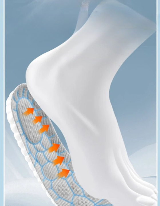- La troisième couche, constituée de petits coussinets d'air est idéal pour améliorer l'évacuation d'air dans vos chaussures et ainsi éviter les odeurs dans vos baskets. De plus, les coussinets d'air offre un soutien structurel et stabilise le pied, réduisant ainsi le risque de blessures.