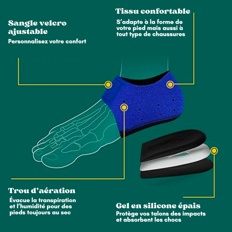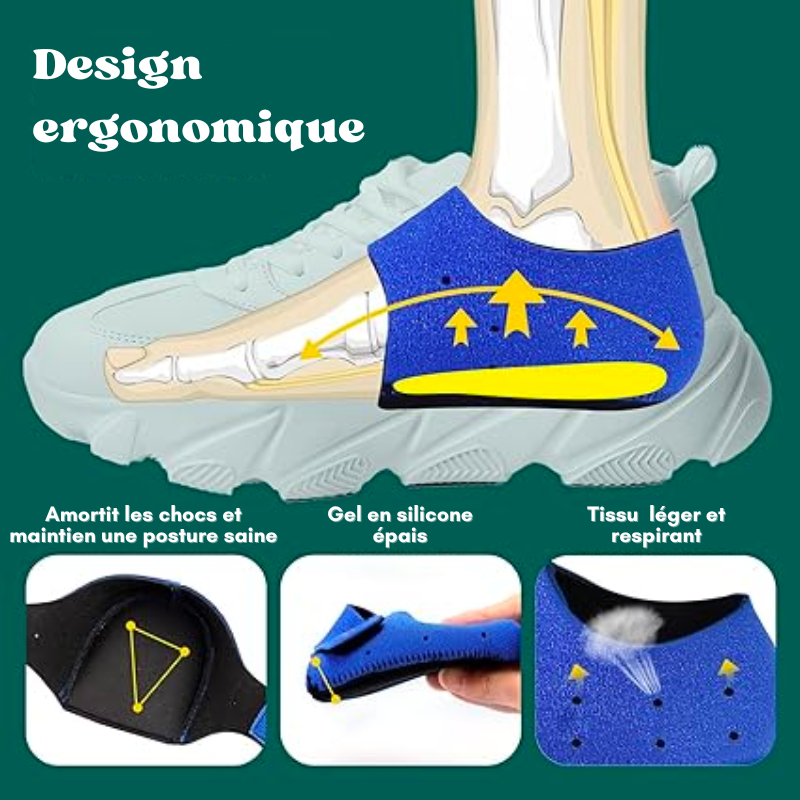 Nos protèges-talons absorbent et dissipent les chocs générés lors des impacts mais aussi ils vous aideront à répartir la pression de manière uniforme et ainsi faire disparaître vos douleurs afin de retrouver une posture saine. Ne laissez plus les douleurs du talon limiter vos activités... Marchez, courez, vivez sans restrictions et retrouvez la liberté de mouvement que vous méritez !